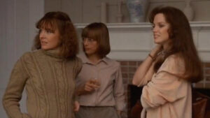While no one would describe Joey as significantly happier, or even better off than her mother, we can see she’s at least livelier, with more of a willingness to express her emotions, even if that involves blurting her feelings in a caustic way. The backgrounds in which we see her are brighter, still only a muted beige or light-gold, but given the significance of interiors and spatial relations throughout this film, it’s not irrelevant that the space Joey occupies is more colorful and feels larger. Meanwhile, Renata is the most talkative of the bunch, to her troubled mother, her indecisive sister, and her husband, whose drinking progressively gets worse, leading to undeserved guilt on her behalf. By the end of Interiors, I felt as if I didn’t get to spend enough time getting to know Flyn, or at least understood her in the same way I had a loose grasp on her sisters. But scenes that show the toll her family’s harsh comments have taken on her as well as one between her and Frederick are enough to confirm she’s not better off, and quite possibly the most scarred of the three.