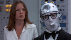 Of course, prior to Sleeper, Allen’s Bananas committed a similar brand of slapstick to film, but I wouldn’t say that was as successful. Allen was still finding his tone, and Sleeper benefits from a more obvious and aware blend of influences, some more evident than others. Of course, similarities to A Clockwork Orange‘s sterile mood, THX 1138‘s costumes, and 2001: A Space Odyssey‘s depiction of the future are clearly present, but downplayed are some of Allen’s subtler nods to H.G. Wells, as he essentially borrows the premise from his novel The Sleeper Awakes (1910). Also listen closely to the medical computer’s voice in the climax of the film; you might recall flashbacks of the first time you heard HAL 9000 from 2001 speak.