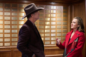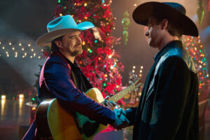 If you’re a country music fan such as myself, you tolerate the storyline (which is pure hokum, if you couldn’t already tell) and stay for the abundance of cameos. Brad Paisley is the biggest name of the bunch, with multiple songs featured in the film, mostly when Winters (James Denton) & Wade are on stage. Awkward lip-syncing ensues when Paisley’s new Christmas ballads “Leave the Christmas Lights On For Me” and “Falling Just Like the Snow” play. Also in tow is Megan Moroney, Jamey Johnson, Drew Baldridge, and Mickey Guyton, and on the old school side, Bill Anderson, Rhett Akins, Pam Tillis, Suzy Bogguss, T. Graham Brown, and Riders in the Sky.
