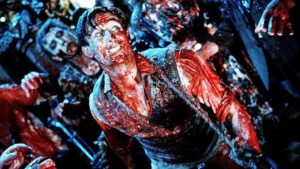 The impact: more than a handful of memorable moments housed within a romp that ostensibly doesn’t know how not to be so gross. A personal favorite comes when Lionel tries to conceal the presence of an utterly repulsive-looking zombie infant by way of a baby-carriage. The infantile zombie winds up seizing control of the carriage before a park-full of tykes and goes on an adventure of his own as Lionel breathlessly chases after him, or it. Another comes during the climactic bloodbath that has Lionel and Paquita together, using the base of a lawnmower to sever and behead numerous zombies all at once as they attempt to overtake a large home.