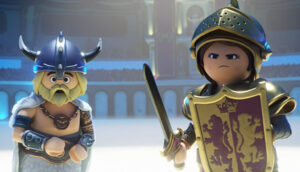 Charlie winds up running away to a toy fair with a gigantic display of Playmobil toys, boasting every facet of the world and history with a Roman Colosseum, Vikings, pirate ships, and more. Marla arrives to scold her brother, but not before he places his Viking figure on the toy-set, which transports them both into the world of Playmobil as figurines themselves. While Marla transforms into her plastic counterpart, Charlie is a bearded Viking, who gets captured by Emperor Maximus (voiced by Adam Lambert); the Emperor plans to have Charlie go toe-to-toe with a T-Rex while Marla must rescue Charlie and figure out how to return home. In her pursuit, she links up with Del (Jim Gaffigan), a quirky food-truck driver who agrees to help her for a lump-sum of Viking currency Marla promises but doesn’t have, along with the slick secret agent Rex Dasher (Daniel Radcliffe), to find him.