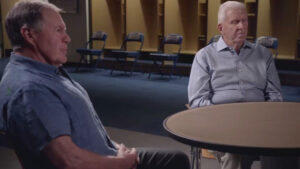 But I’m getting ahead of myself. In order for this special documentary to happen, director Ken Rodgers gets Parcells and Belichick into the Giants’ locker-room together for the first time in many years. It’s a rare sight to see Belichick visibly emotional when he revisits old film-rooms and areas where staff meetings where held, overwhelmed with memories of how much time him, Parcells, and the rest of the Giants staff spent conceiving game-plans. Parcells became head coach of the Giants in 1983, with Belichick being hired in 1985 as the team’s defensive coordinator. Success for the men and their team in the form of a tremendous, ’85 Bears-esque playoff run culminated with a Super Bowl victory to cap off the 1986 season. While both coaches, with plenty of hindsight on their side, are quick to commend the efforts of their many talented players (Lawrence Taylor being one of them), no one can deny how exceptional their coaching was in key games.