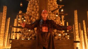 Meanwhile, Dr. Ian Kelson (Ralph Fiennes) continues to preserve his titular temple, which he erected to serve as an ossuary for those who have died during the outbreak. His newest patient is an infected Alpha he calls “Samson” (Chi Lewis-Parry), a brutish male whom frequents visits to Ian to satisfy his addiction to morphine. Slowly, Samson appears to be regaining his sanity, and later doesn’t even react with violence at the sight of the doctor. This gives the pensive Ian belief that the Rage Virus is indeed curable, although his morphine supply is rapidly dwindling.